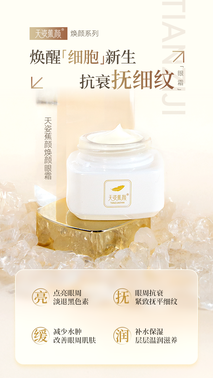 天姿蕉顏煥顏眼霜 醫(yī)美系列產(chǎn)品 閱讀 2024-01-18 天姿蕉顏煥顏眼霜,蘊含麥角硫因、依克多因、類蛇毒肽等珍貴抗衰修護成分,同時甄選天然植物大蕉果、蘆薈、甘草根、當(dāng)歸根、山茱萸果等多種植萃精華。